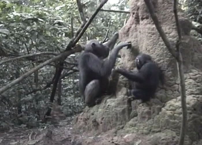 首次有猩猩被拍到教导下一代使用工具。