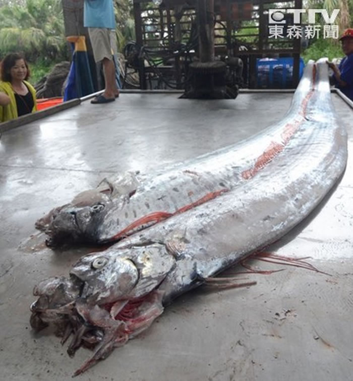 台湾两次地震震出2条4米多长的俗称地震鱼的勒氏皇带鱼 据ETtoday:台湾花东地区27日发生两起规模5以上地震,整夜摇个不停,28日下午台东太麻里海边地置渔网就一次闯进2条4米多俗称地震鱼的勒氏皇带鱼,渔民罕见捕获2条,当地居民惊讶没看过如此巨大的地震鱼,议论纷纷,都跑到海边凑热闹、开眼界。虽然专家多认为并没有太多相关研究,但当地居民觉得或多或少与地震相关。 在花莲双震后,俗称「地震鱼」的勒氏皇带鱼,一次2条被台东太麻里的渔民发现,捕获上岸。2条鱼双眼巨大、身体扁长,龇牙裂嘴的模样相当吓人,尺寸差不多大,长4公尺40公分,重45公斤,要3、4个渔工齐力才抱得起来,引来当地居民好奇,纷纷到海边抢着拍照、凑热闹,见证罕见的一刻,惊呼一定是「地震的关系啦!」 (x-riddle收集整理) |