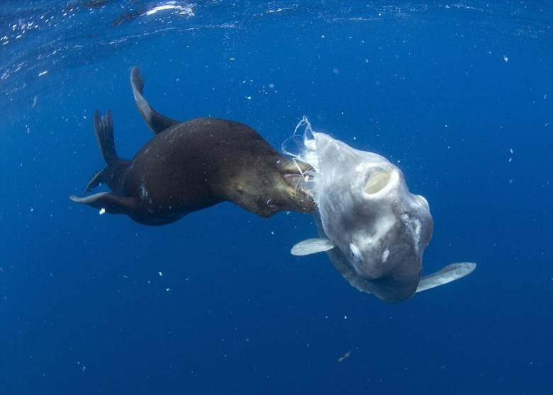 海狮无惧体型比自己大5倍的翻车鱼