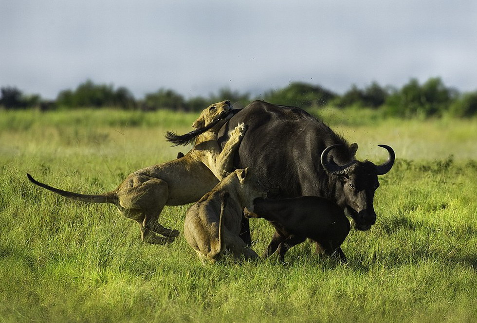 勇敢的母野牛冒着生命危险,试图从狮口下挽救牛犊。