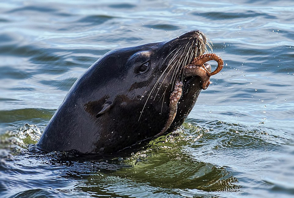美国摄影师安德鲁·李抓拍到海豹与章鱼激战的多张照片,最终海豹获得胜利,成功将对手吞下。