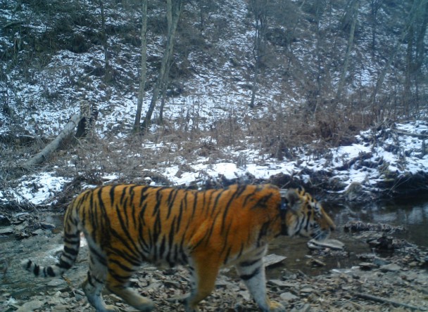 图为普京放生的老虎乌斯京,目前仍有黑龙江活动。