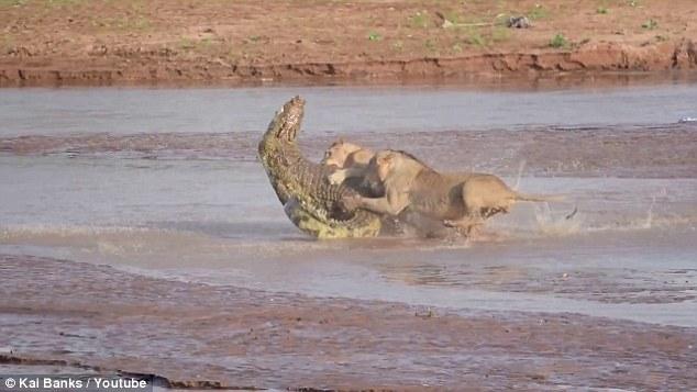 肯尼亚Samburu野生动物保护区数头狮子大战尼罗鳄