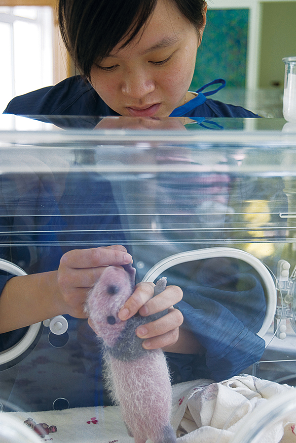 保育员对熊猫宝宝无微不至的照顾,包括帮助它们排便、量体温、秤体重,监测它们的生长状况等。摄影:罗小韵