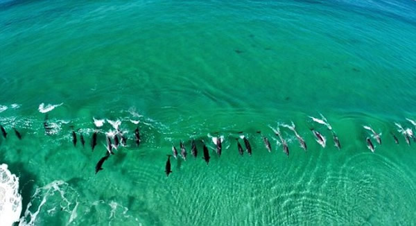 澳洲西澳省艾斯帕兰斯海岸超过100条樽鼻海豚在冲浪 澳洲男子里格斯平时以无人4轴飞行器,从高空拍摄大白鲨,他最近在西澳省艾斯帕兰斯海岸,拍到超过100条樽鼻海豚在嬉水畅泳。只见海豚或在浪间穿梭,又或是乘着浪头冲浪,场面煞是壮观。 专家指海豚与人一样,喜爱冲浪,有时更会跃得比浪头还要高。 (x-riddle收集整理) |