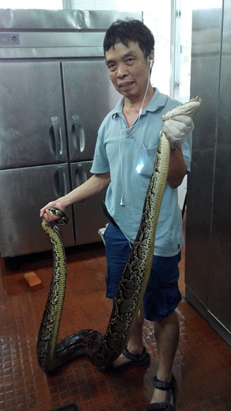 蛇王将大蟒蛇擒获 香港早上9时许,赤柱黄麻角道解放军军营,发现有一条3米长大蟒蛇闯入,于是报警,由蛇王奉召到场捉蛇。 (x-riddle收集整理) |