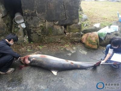 研究人员现场解剖了解死因。(图/新北市动保处提供)身上多处圆形伤口是达摩鲨的咬痕。(图/新北市动保处提供)据ETtoday:一只青少年弗氏海豚搁浅在福...