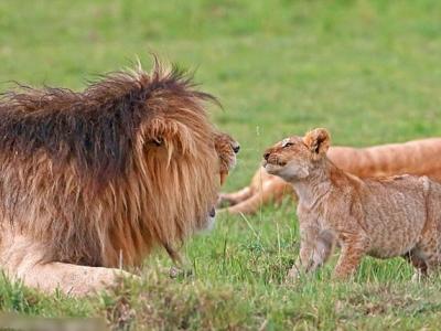 幼狮无惧走到父亲面前幼狮以微弱声线向父亲咆哮雄狮眼见儿子声线不足,遂作出示范。幼狮走到父亲嘴边撒娇[迷记录 插图]法国两名摄影师早前到肯尼亚一个动物保育区,目睹...