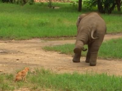 幼象以后腿指向小猫并摇晃数下,态度嚣张。幼象以长长的象鼻挑衅小猫[迷记录 插图]泰国清迈一头年幼大象,与母亲散步时遇上路边一只小猫,竟做出一连串挑衅行为,似乎想...
