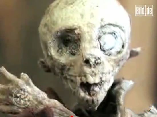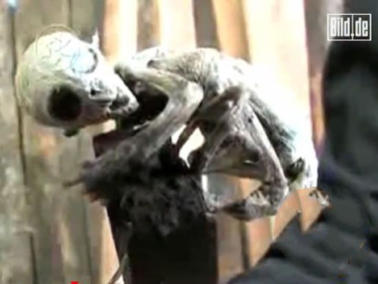 “外星人宝宝”尸体被制成标本 据德国《图片报》8月24日报道,墨西哥电视台近日公布了一条令人难以置信的消息,2007年5月在该国的一个农场内,人们在一个动物陷阱里发现了仍然活着的外星人宝宝!如今,科学家已经对此事件展开调查。 那真的是一个来自外太空的生命?还是在这件事情背后隐藏着一个大骗局? 明星主持人、同时也是一位飞碟专家的茂森在其节目中指着已经被制成标本的外星人宝宝的照片,兴奋地说:“我敢肯定这些照片都是真的!” 据称,当时农场的工作人员由于害怕,将这个外星人宝宝活活淹死。它不停地挣扎、扭动身体,还大声呼喊。农夫们尝试了3次,让其在水中待了数个小时才最终杀死它。 农场的主人是偶然间在那个偏远的地方,有了这次令人感到不可思议的重大发现。不过,直到去年年底,他才把外星人宝宝交出来,送到当地的大学进行科学研究。科学家们用核磁共振成像技术对外星人宝宝进行了DNA比较和分析工作。 如今,检测结果出来了。外星人宝宝的尸体标本不是人造的。它的身体构造与蜥蜴的非常类似(比如,它的牙齿没有牙根,可以长时间在水下生存等),不过也展现出了人类的某些特性,比如它的肢体关节构造。它的脑子很大,特别是后半部分,对人类来说,就是主管学习和记忆的脑组织比较发达。由此,科学家得出结论,这种生物是非常聪明的。 在发现外星人宝宝的地区,经常有报道说看到了不明飞行物和神秘麦田圈。因此有人怀疑,这个宝宝是外星来客造访地球之后,无意中或者带有某种意图故意留下来的。 茂森表示,农夫们曾告诉他,当时在农场里其实还有一个外星人!当它发现那个陷阱之后就逃跑了。